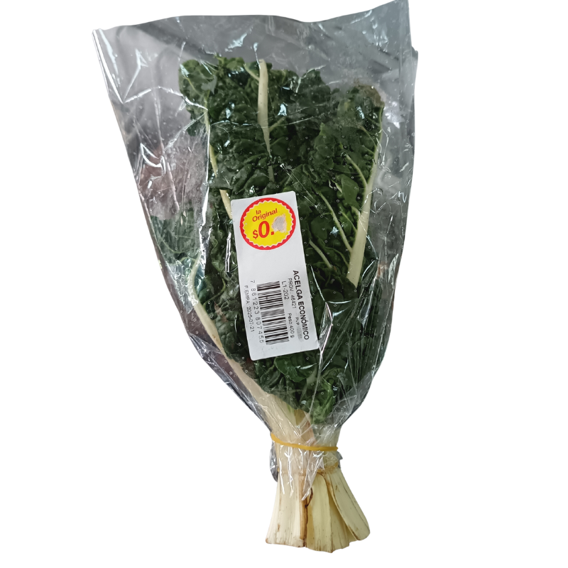 Atado de acelga fresca (aproximadamente 400 g) envuelta en funda plástica. Presenta hojas verdes crujientes y tallos blancos nutritivos, ricos en fibra, vitaminas (A, C, K) y minerales como hierro y potasio. Ideal para cocinar en guisos, cremas, salteados o ensaladas saludables