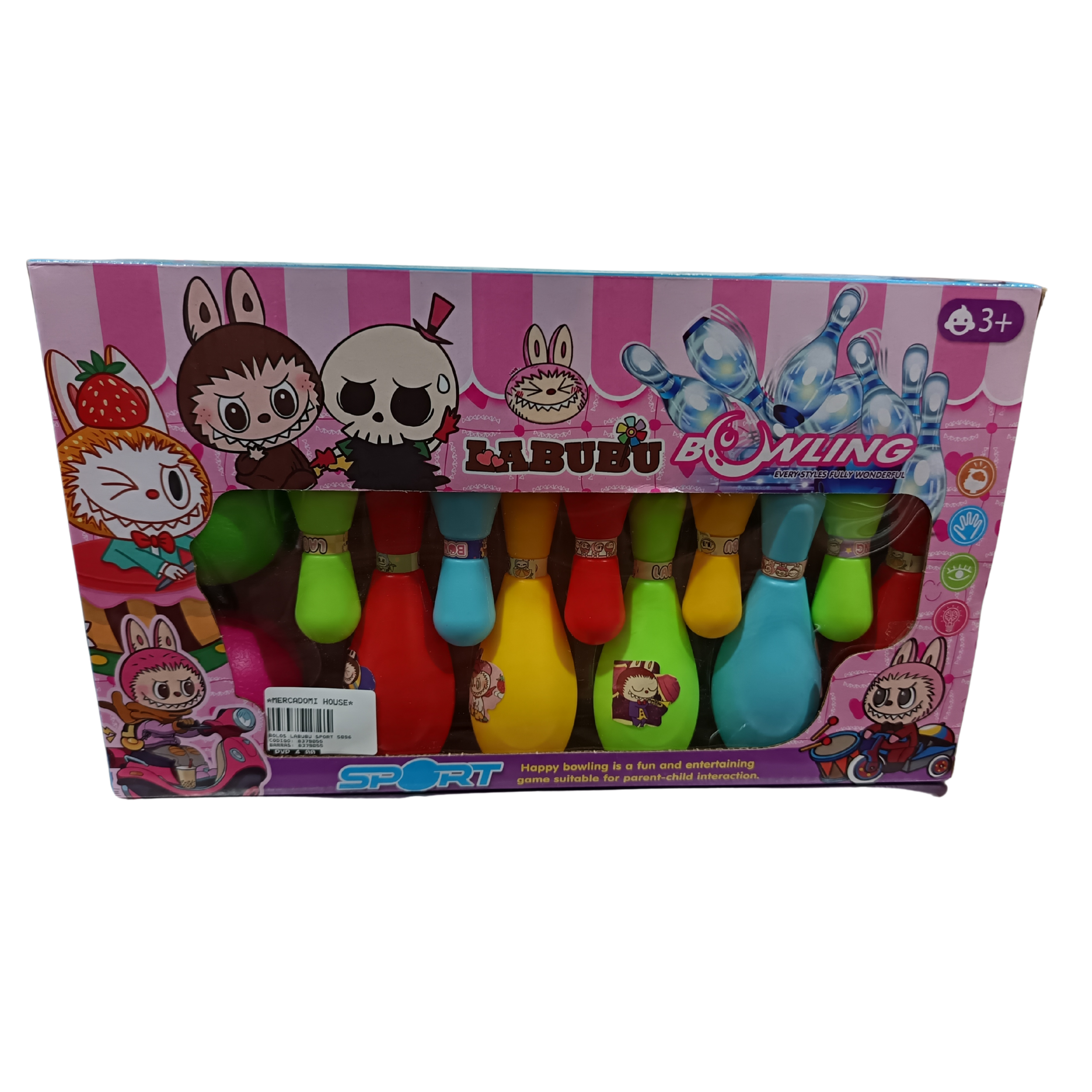 Juego de bolos infantil compuesto por 6 piezas de diseño divertido “Labubu” y bola ligera para lanzamiento. Fácil de montar y transportar, ideal para desarrollar la coordinación y disfrutar en familia.