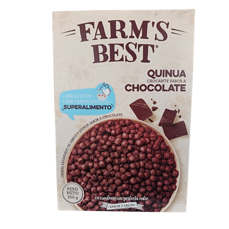 Cereal crocante de quinoa con sabor a chocolate, sin gluten. Ideal como desayuno o snack nutritivo, combinando el sabor dulce del cacao con los beneficios de la quinoa ric@s en proteína, fibra, vitaminas y minerales.