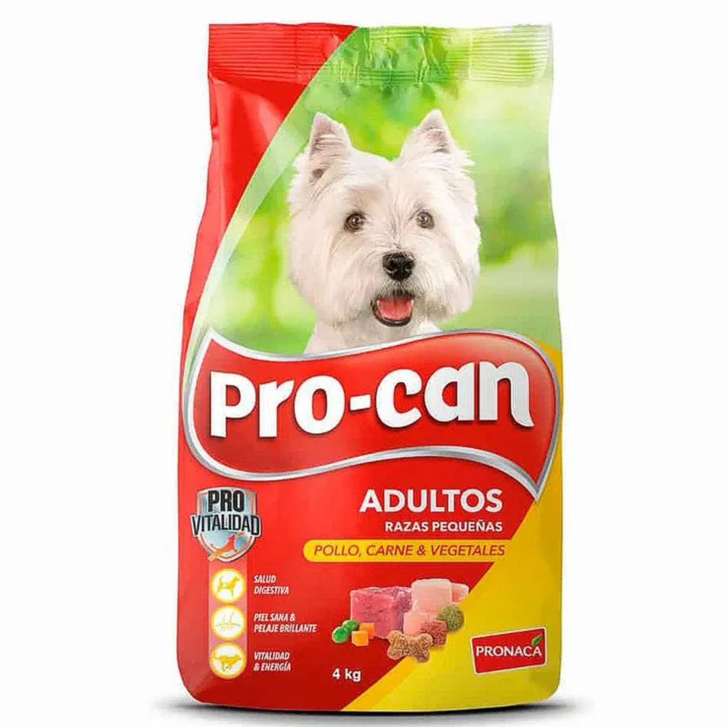 Alimento para perros tipo croquetas con sabor a pollo, carne y vegetales. Ideal para perros ADULTOS de razas pequeñas. Promueve una piel y pelaje saludable brindando al perro vitalidad y energía. Medidas del empaque: 10 x 43 x 25.5 cm. Peso: 4 kg. PRO CAN