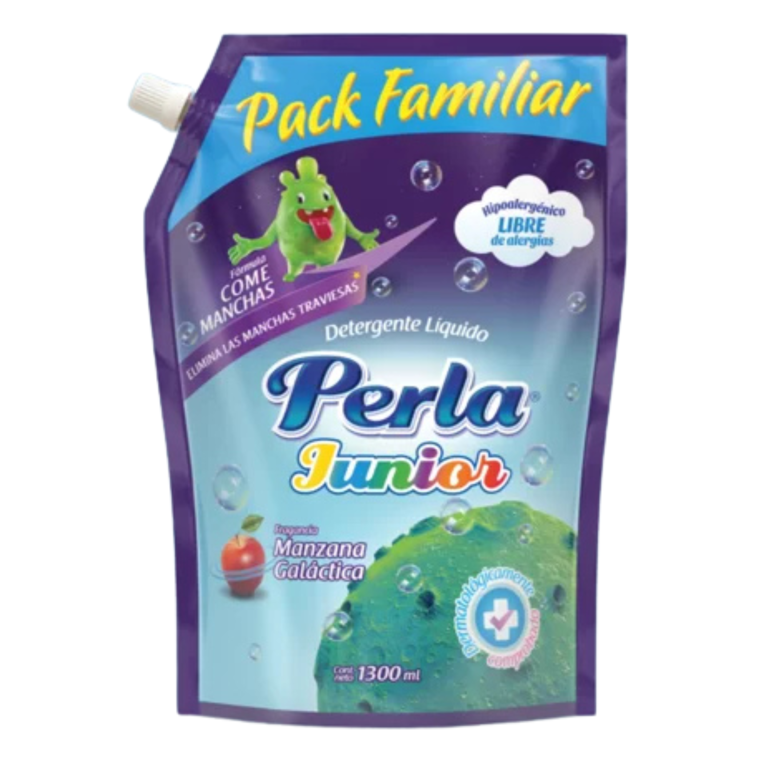 «Detergente líquido Junior Perla Manzana Galáctica 1300 ml. Especial para ropa de niños, con fragancia divertida, fórmula suave y limpieza eficaz.»
