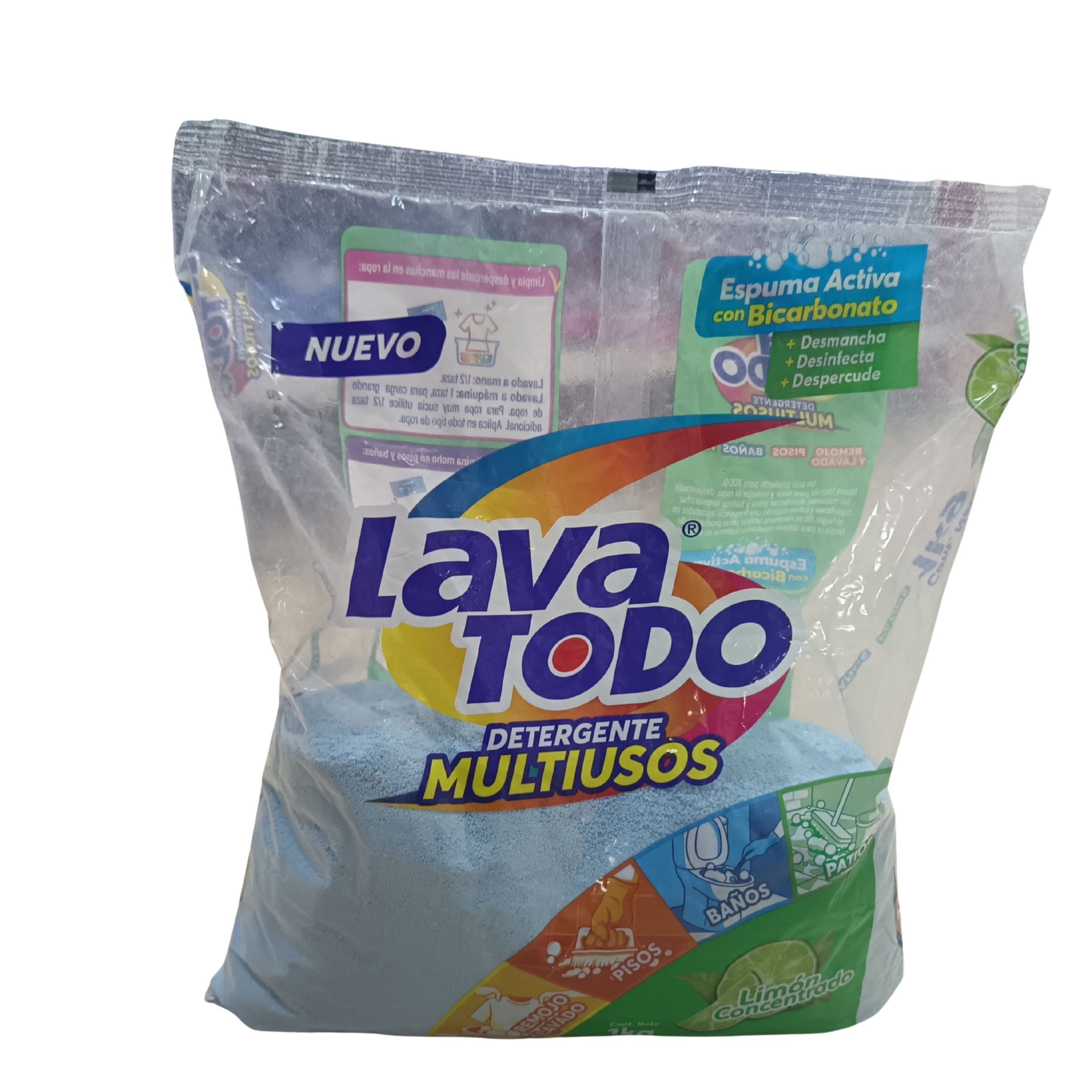 Detergente multiuso en polvo con aroma cítrico a limón, ideal para lavar ropa, desinfectar pisos, baños y otras superficies domésticas.