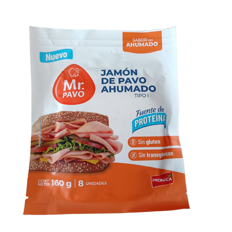 Jamón de pavo ahumado MR. PAVO 160 g (8 unidades), sabor ahumado y textura delicada. Ideal para sánduches y refrigerios