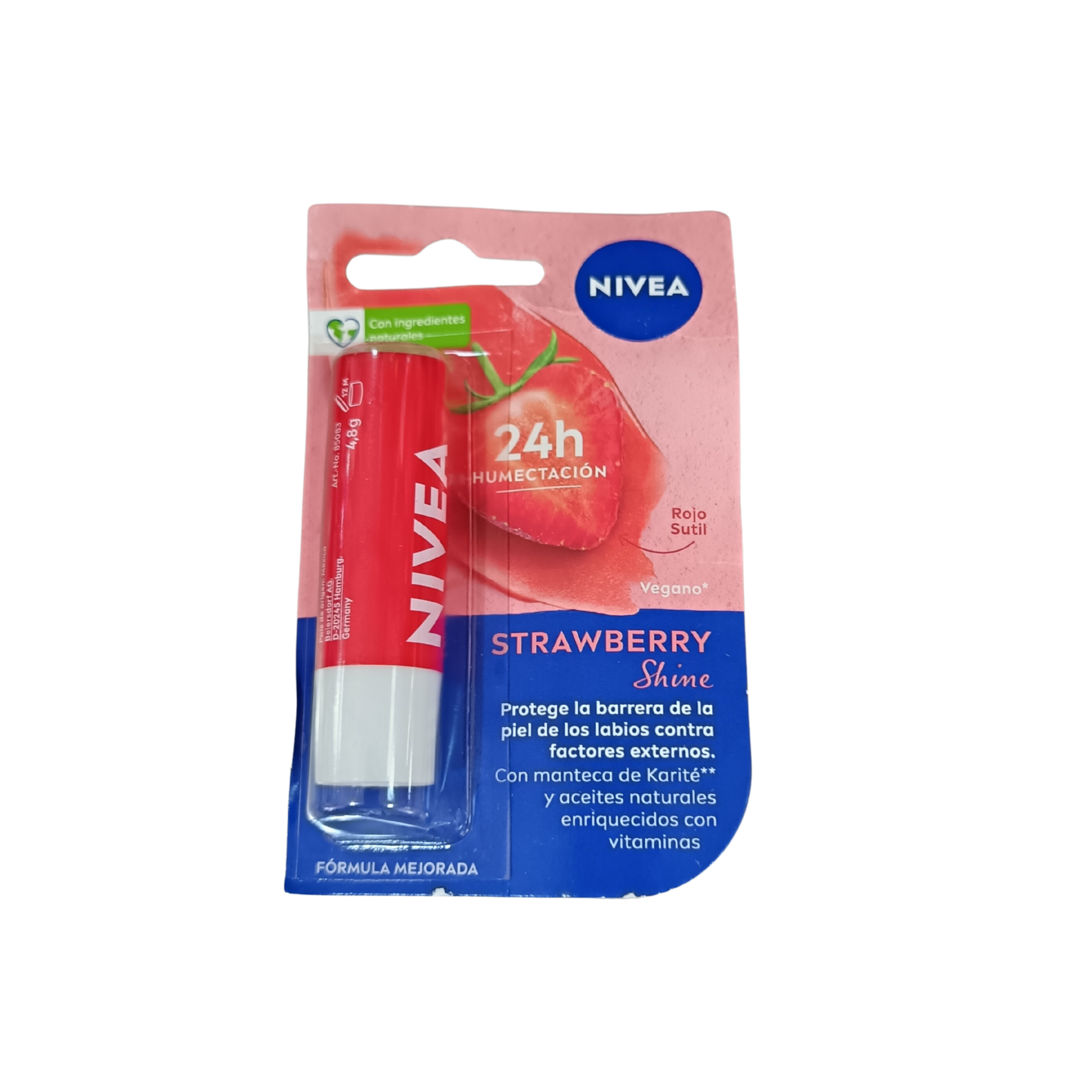 El NIVEA Lip Care Fresa 4.8 g es un bálsamo labial que ofrece hidratación duradera, un toque de color y un agradable aroma a fresa.Su fórmula contiene aceite de almendras y vitamina E, proporcionando suavidad y protección a los labios