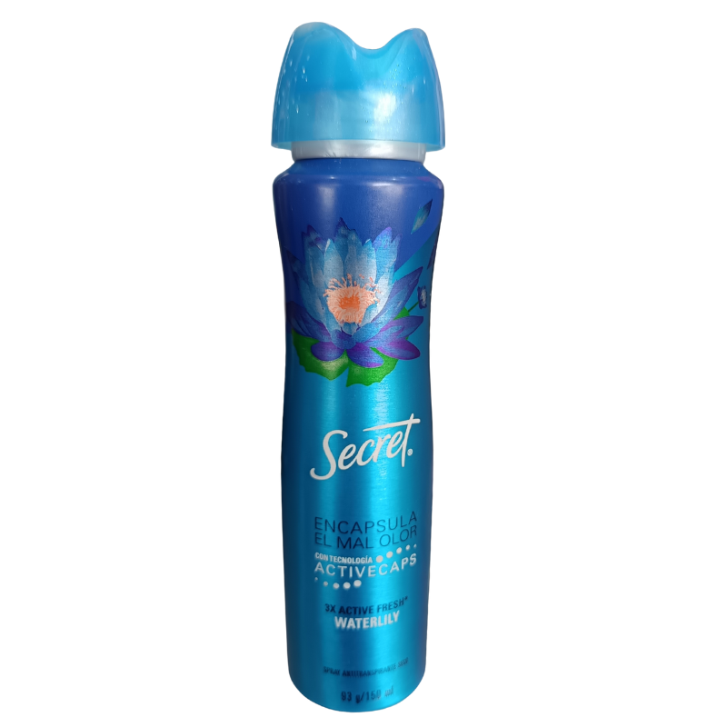 Antitranspirante en spray Secret Waterlily 150 ml, con delicado aroma a lirios de agua. Protege eficazmente contra el sudor y el mal olor durante todo el día, gracias a su fórmula con clorhidrato de aluminio —y deja una sensación fresca y suave