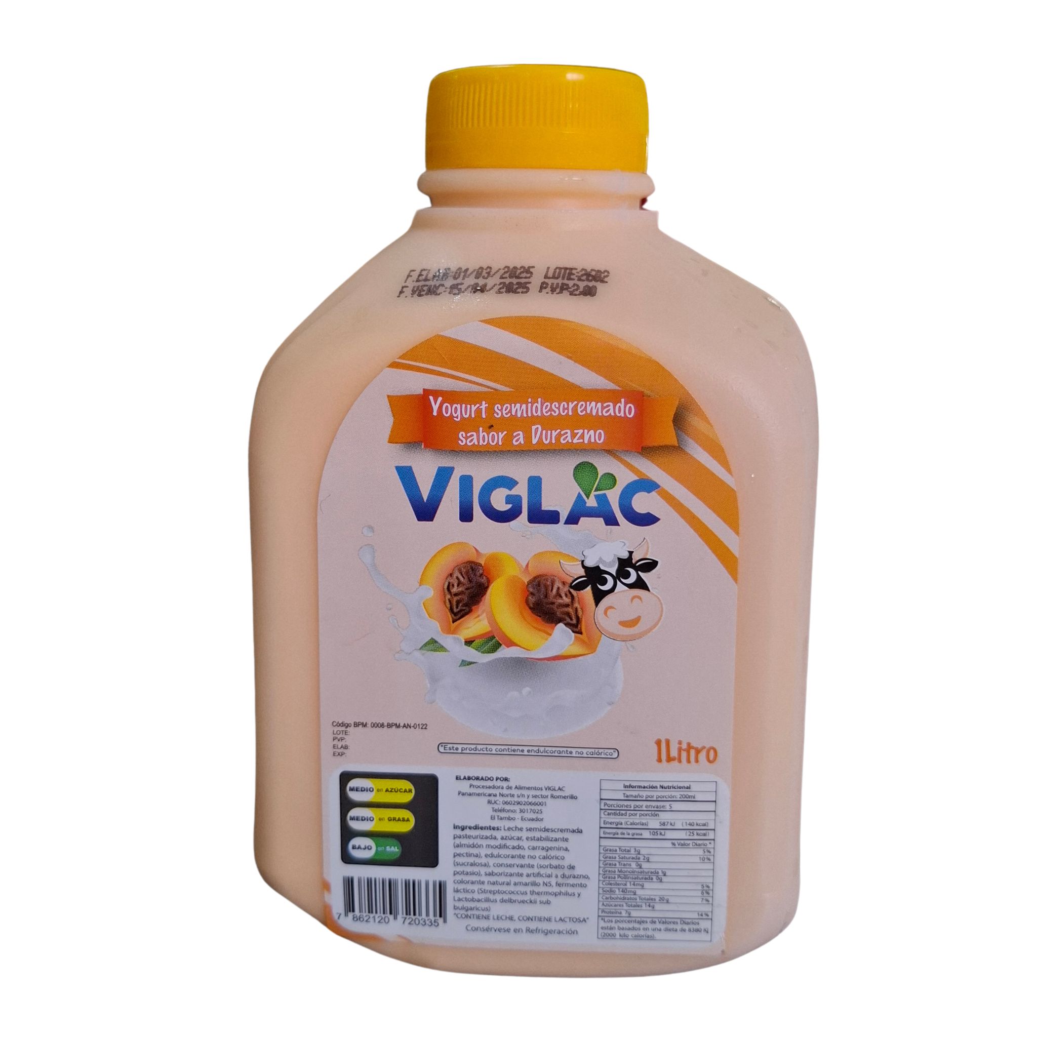 ¡Un yogurt lleno de beneficios! Yogurt Viglac durazno 1 litro, elaborado con ingredientes de alta calidad y probióticos para tu bienestar. ¡Cuida tu salud con sabor!